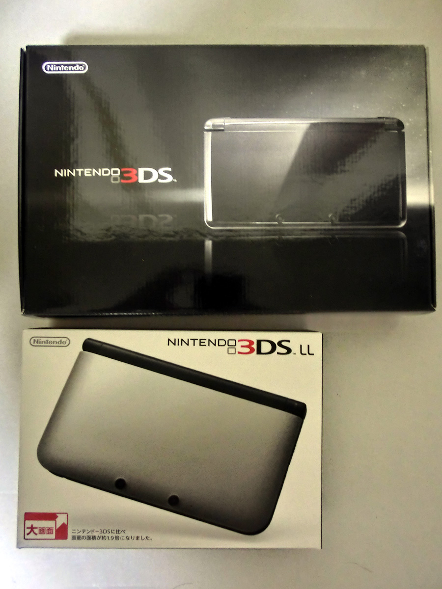 しかし充電器や充電スタンドを省いてプライスダウンを図っただけあって箱が小さくて驚いた。 上段が3DS箱、下段が3DSLL箱 |
