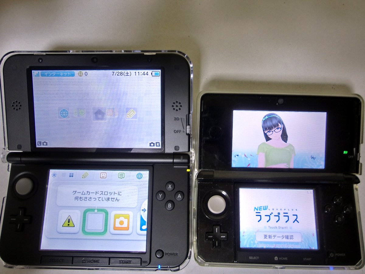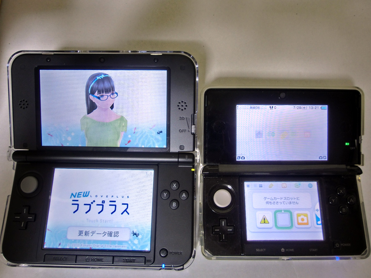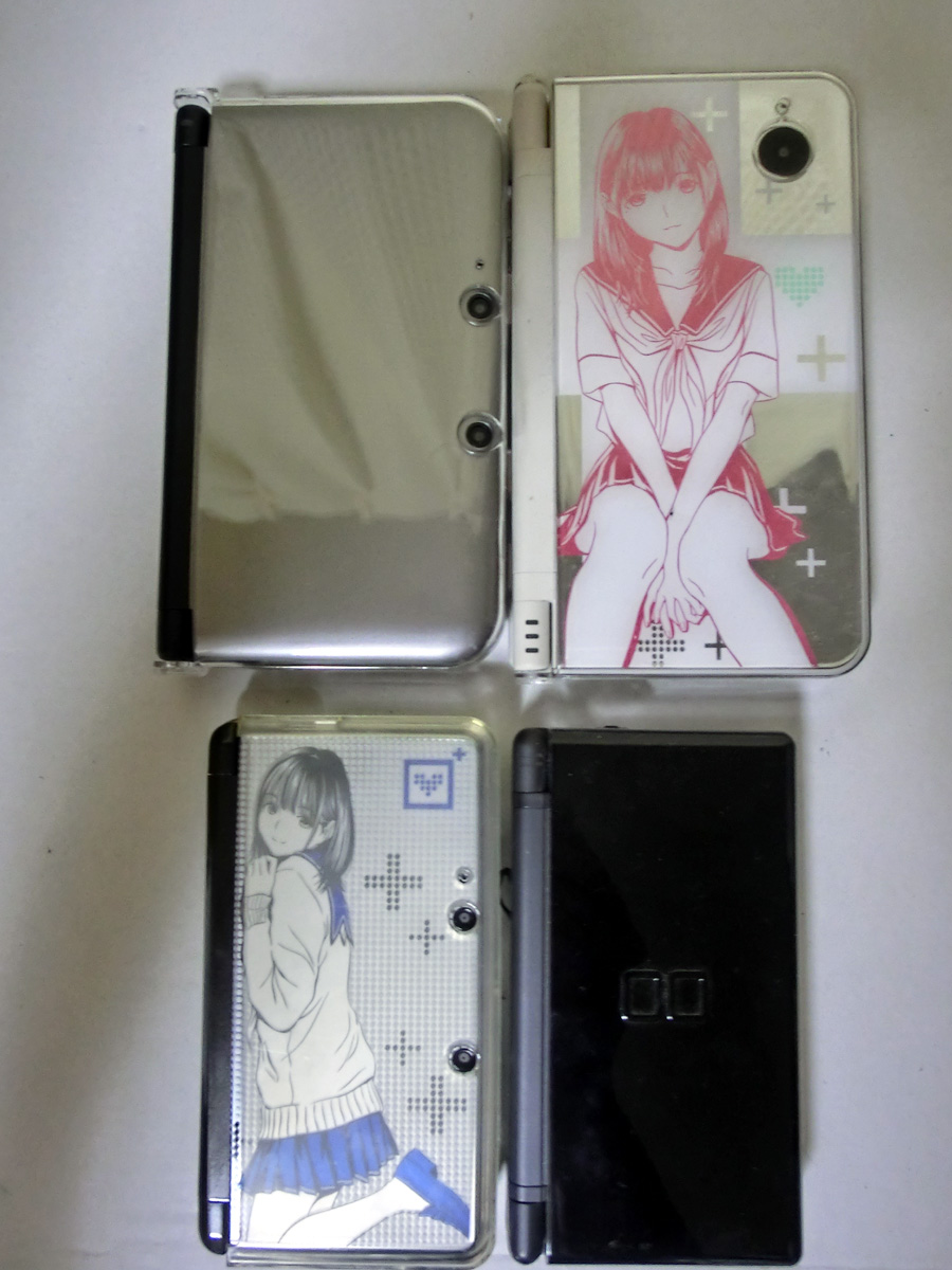 持ってるDSでサイズ比較 左上:3DSLL 右上:DSiLL 左下:3DS 右下:DSlite 写真では分かり辛いがDSiLLが一番大きく重く感じた。 しかしこんなにDS持っててどうすんだオレ・・ソフトよりハードの方が多い気がする。 |