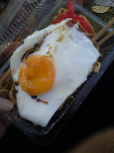 海鮮出汁のきいた焼きそばに半熟卵がのっていて後がけソースが付いていた。
