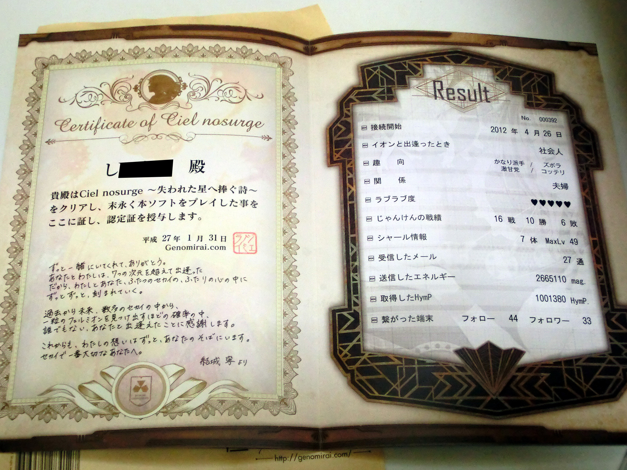 シェルノサージュクリア記念のサービスでイオンタンのメッセージが入ったCDとクリア証明書が入っていた。