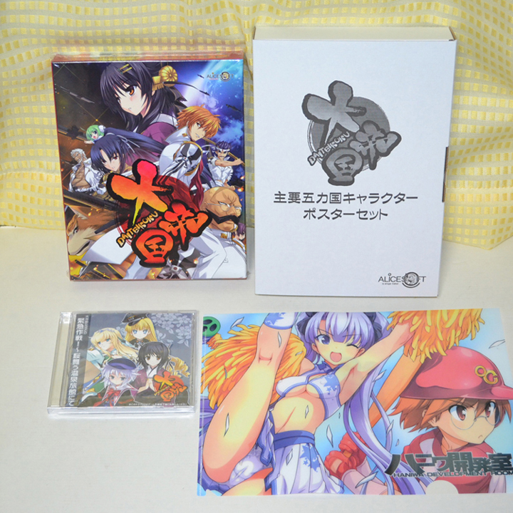 で、写真の説明ですが左上がソフト、右上が予約特典ポスター、左下がアリスショップ限定特典CD、右下がいつもアリスショップで購入すると明細書が入ってるクリアファイルですが毎回絵柄が違います。即ちゲームとは関係ありません。